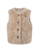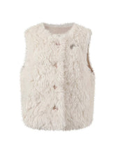 Luxurious shearling-effect vest with a plush curly texture and soft tactile feel. Features a bold Soote Season logo pin at the chest for added style impact. Relaxed cropped silhouette pairs well with any bottom, enhancing proportions and layering versatility. Thick, non-stretch handle ensures warmth and structure, making it an essential for cozy fall and winter looks.