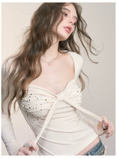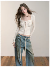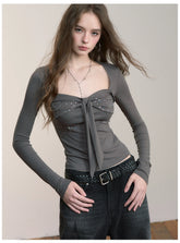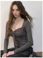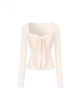 This statement blouse blends colorful rhinestone embellishments into a long-sleeve fitted silhouette. The large U-neckline highlights the collarbones and adds feminine charm. The front butterfly-shaped knot enhances dimension and structure, making it perfect for layering or wearing alone in your daily styling.
