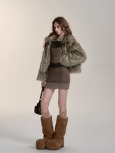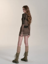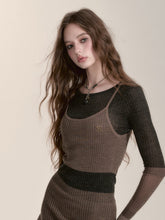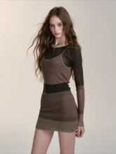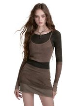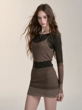 This design combines a striped knit sweater with a layered structure that mimics a two-piece outfit, using a hem + shoulder strap to create a stylish layered look. The silhouette enhances body shape, while the structured knit fabric offers comfort and elegance for autumn and winter.