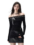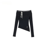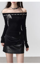 Product Name: Black & Brown Off-shoulder Knitted Long Sleeve T-shirt