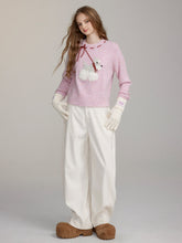 A stylish and cozy sweater featuring a playful dog motif in a contrasting knit design. The textured knit pattern and extended collar offer a dimensional, rich visual appeal.