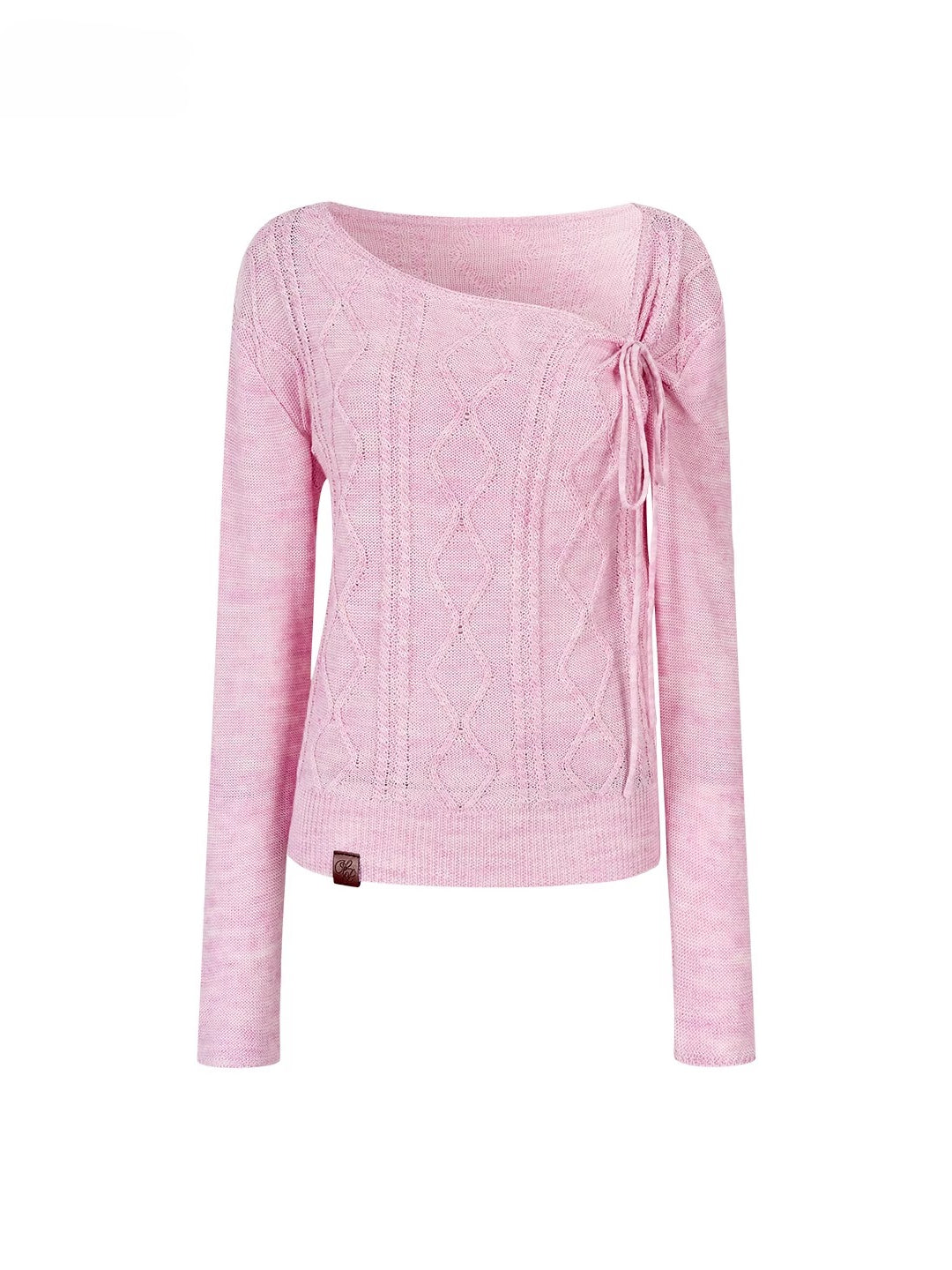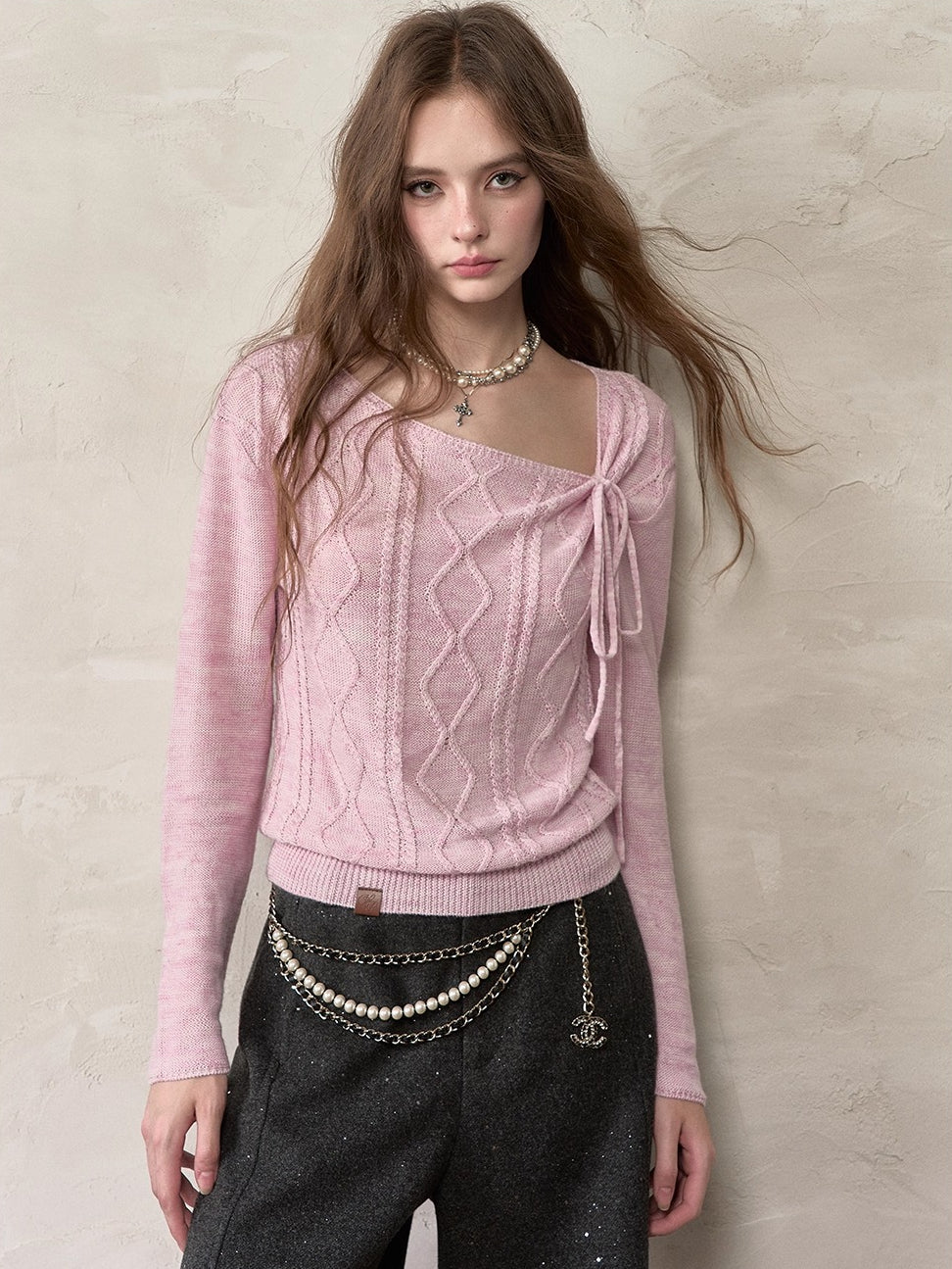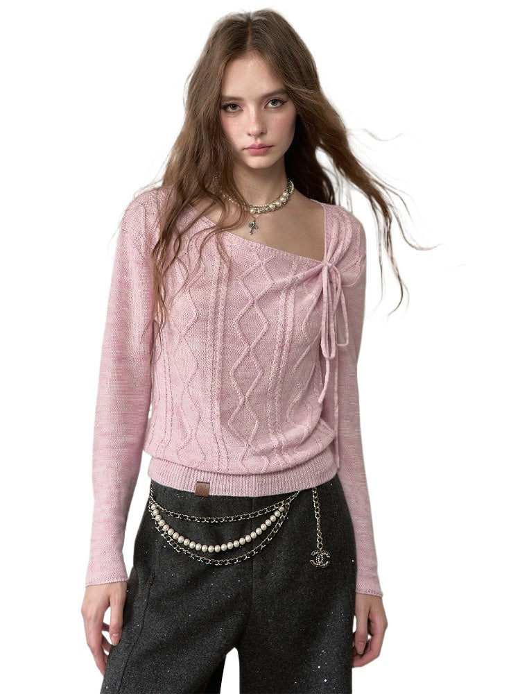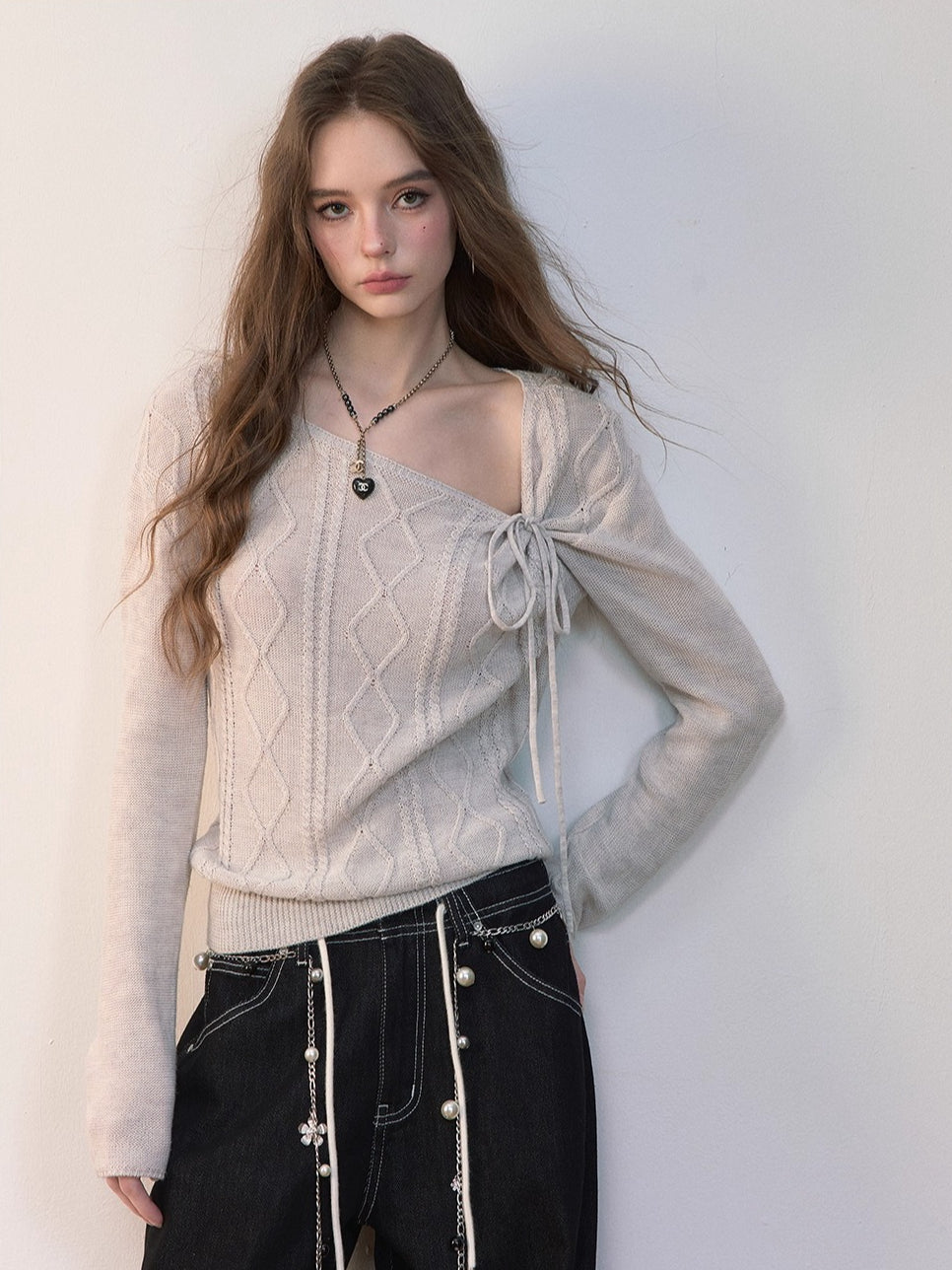 A knitwear piece that breaks traditional patterns with an asymmetrical neckline and tie detail. The cable-knit texture adds visual richness and structure, effortlessly enhancing autumn and winter looks with cozy sophistication.