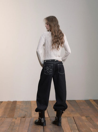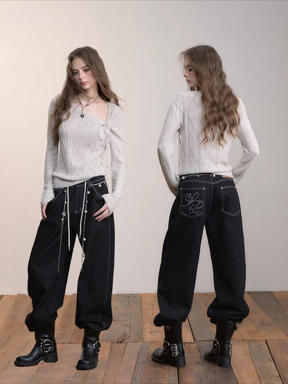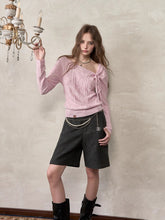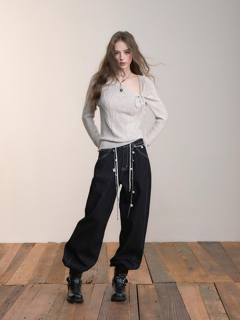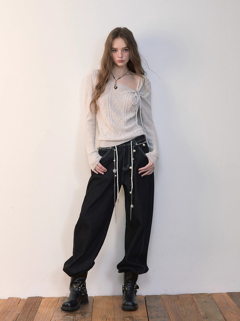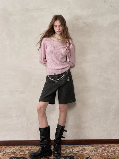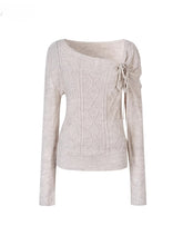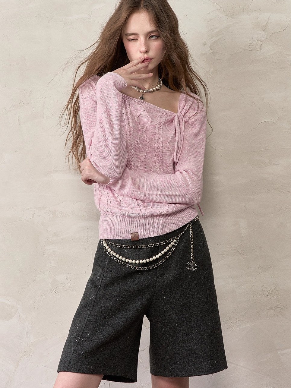 A knitwear piece that breaks traditional patterns with an asymmetrical neckline and tie detail. The cable-knit texture adds visual richness and structure, effortlessly enhancing autumn and winter looks with cozy sophistication.
