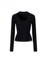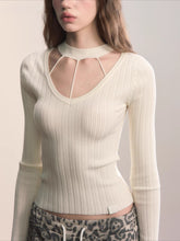 A refined ribbed knit top featuring a choker-style neckline that accentuates the collarbone with an alluring touch. Crafted from a soft viscose-blend yarn, it offers excellent elasticity and a smooth, skin-friendly feel. The three-dimensional rib texture creates a flattering silhouette that hugs the curves while maintaining comfort and breathability. Its clean minimal design makes it an effortlessly versatile layering piece for fall and winter styling.