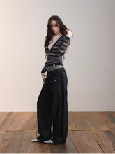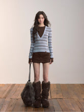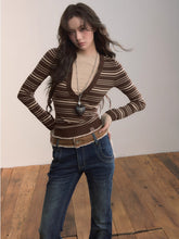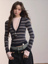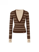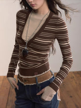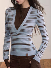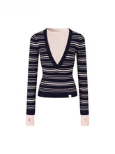 A fitted striped knit top combining classic patterning with modern color contrast. Crafted from a viscose-blend yarn that provides a smooth and breathable texture, it features a front deep V-shaped stripe pattern that elongates the neckline while adding a playful visual rhythm. The contrasting cuffs and hem enhance dimensionality, creating a stylish layered effect. Designed for a slim silhouette that hugs the body comfortably, this versatile piece transitions effortlessly between casual layering and chic everyday wear.