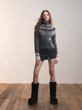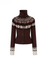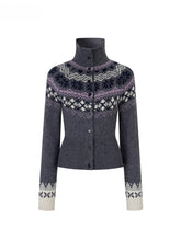 A refined high-neck cardigan featuring intricate Fair Isle patterns for a timeless winter look. Made from a soft cotton and wool-blend yarn, it offers warmth, breathability, and gentle elasticity for all-day comfort. The extended ribbed neckline protects the neck while shaping a sleek silhouette, and the cropped fit subtly accentuates body proportions. Rich multi-color patterns enhance visual depth and bring Scandinavian charm to everyday layering.