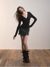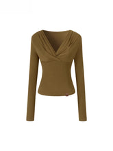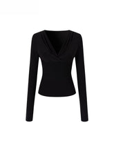 A versatile V-neck long-sleeve top crafted from a soft and breathable Lyocell blend for a naturally smooth touch and flattering drape. The lightweight knit incorporates stretch nylon and wool for improved resilience and gentle warmth, while the delicate rib texture enhances shape retention. The deep V-neckline with front gathers beautifully contours the bust line, offering both comfort and subtle sensuality. Perfect for layering in fall and winter, this piece transitions effortlessly across casual and chic ensembles.