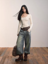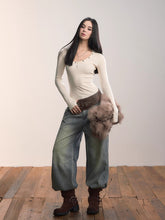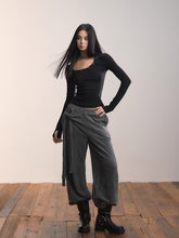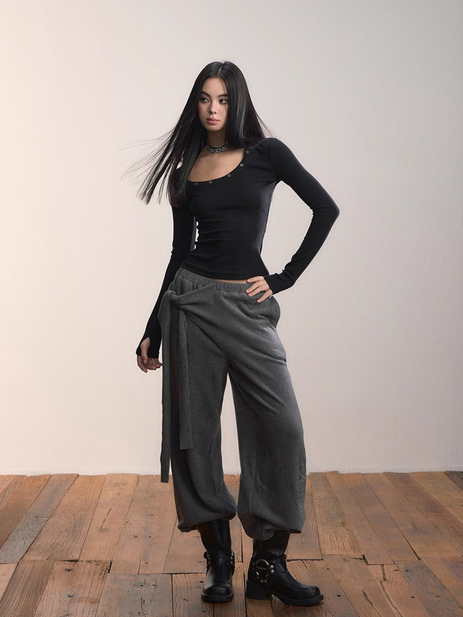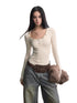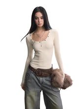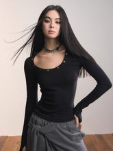 A refined long-sleeve knit top designed with an asymmetric deep U-neckline for a modern and flattering silhouette. Made from a soft viscose–cotton blend with slight stretch, the fabric offers a smooth ribbed texture and breathable comfort. Rivet embellishments along the neckline introduce a hint of edge, balancing minimalism with street-style confidence. Perfect for layering under jackets or styling solo for a clean yet distinctive fall/winter look.