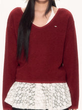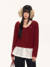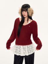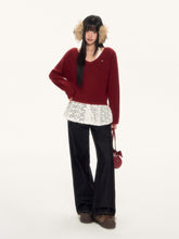 This two-piece design combines a soft textured outer knit with a delicate lace halter inner layer, offering both warmth and femininity. The neckline and hem feature refined lace accents for added dimension. The matching lace inner top enhances the festive mood, pairing especially well with the classic combination of red and white. Suitable for layered styling in autumn and winter, this set brings comfort and seasonal elegance to everyday outfits.