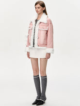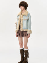 A stylish short fleece-lined denim jacket featuring plush accents and adorable bear details. This jacket offers a cozy, playful design, perfect for staying warm and fashionable during the autumn and winter seasons.