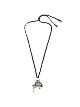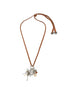 Hand-braided leather cord long necklace, adorned with an organically patterned stone and a custom silver-tone heart charm. Features multiple metallic key-shaped elements that add a dimensional, detailed feel. Customizable braided leather cord with a circular clasp allows adjustable length. Unique color finish enriches visual depth and highlights the overall design with ease.