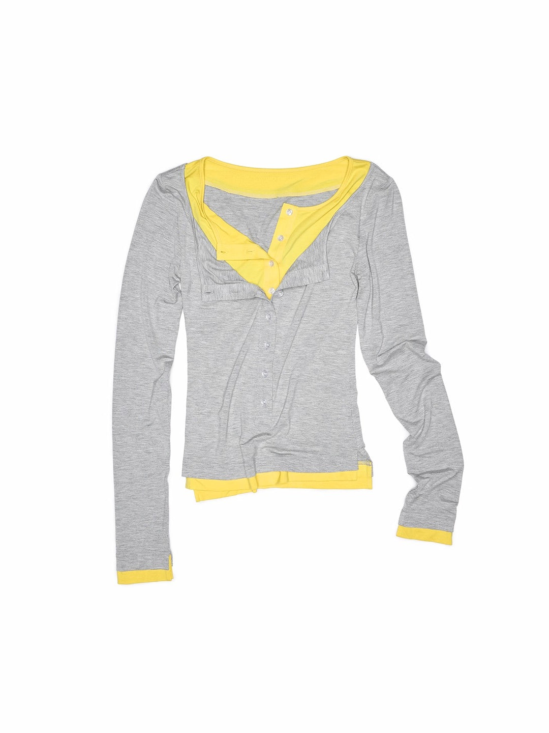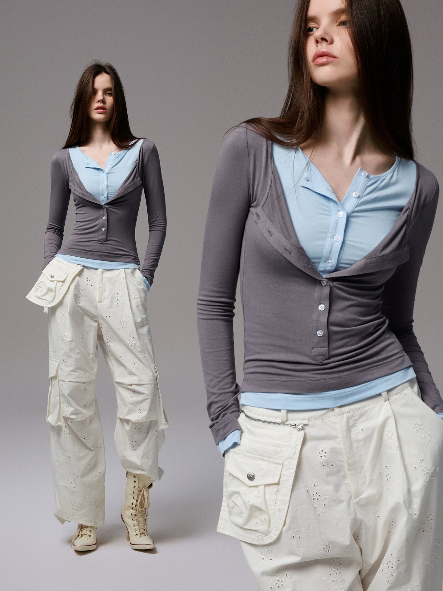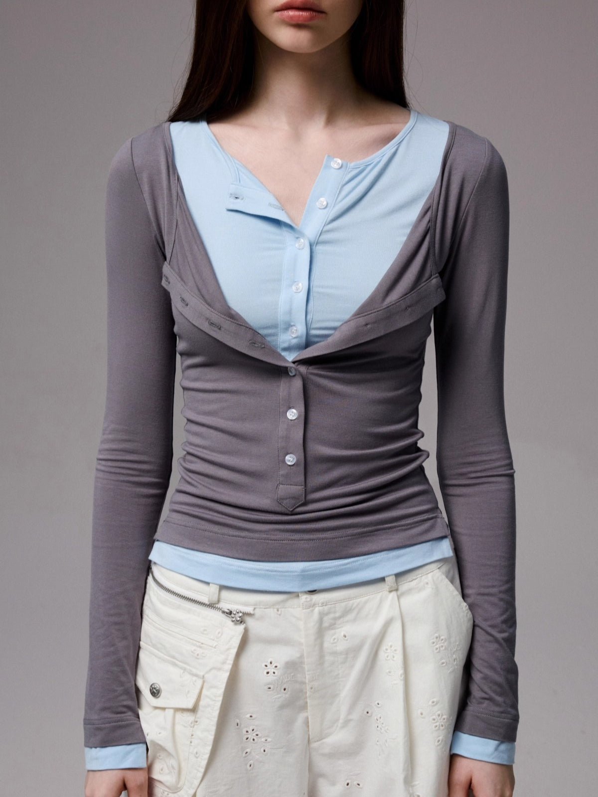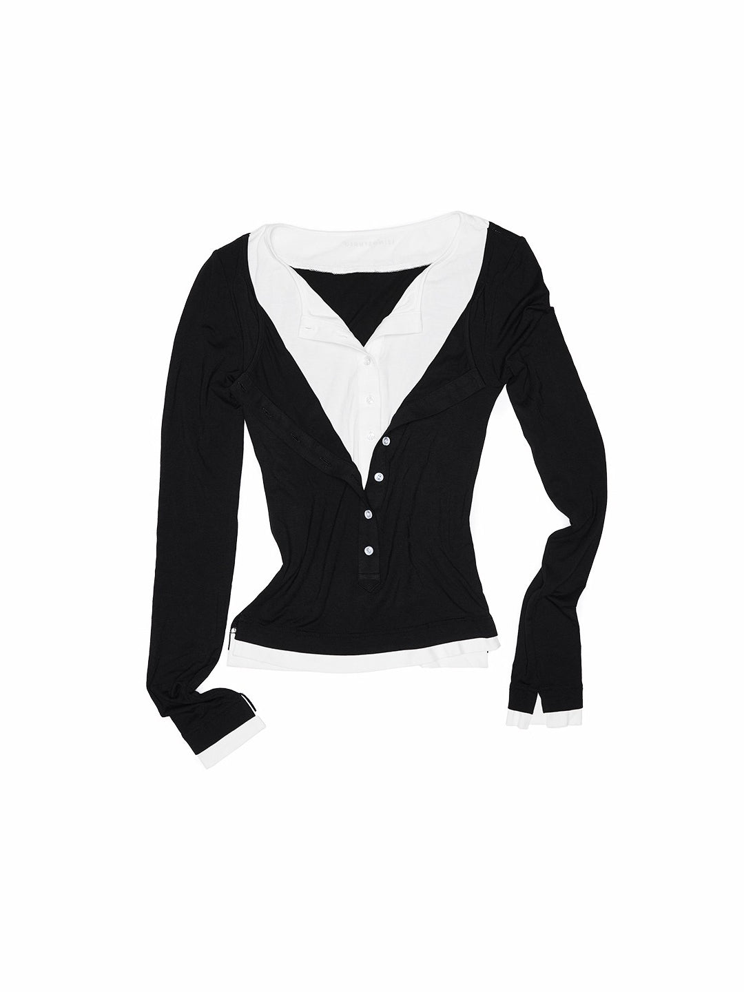 Dual-layer knit Henley collar with an integrated slimming cut and faux two-piece silhouette. The contrast design at the collar, hem, and cuffs creates layered visual effects. Clean but not simple. Made with high-stretch knit for a soft, breathable texture with a skin-friendly, structured finish—balancing ease and style.