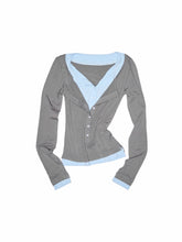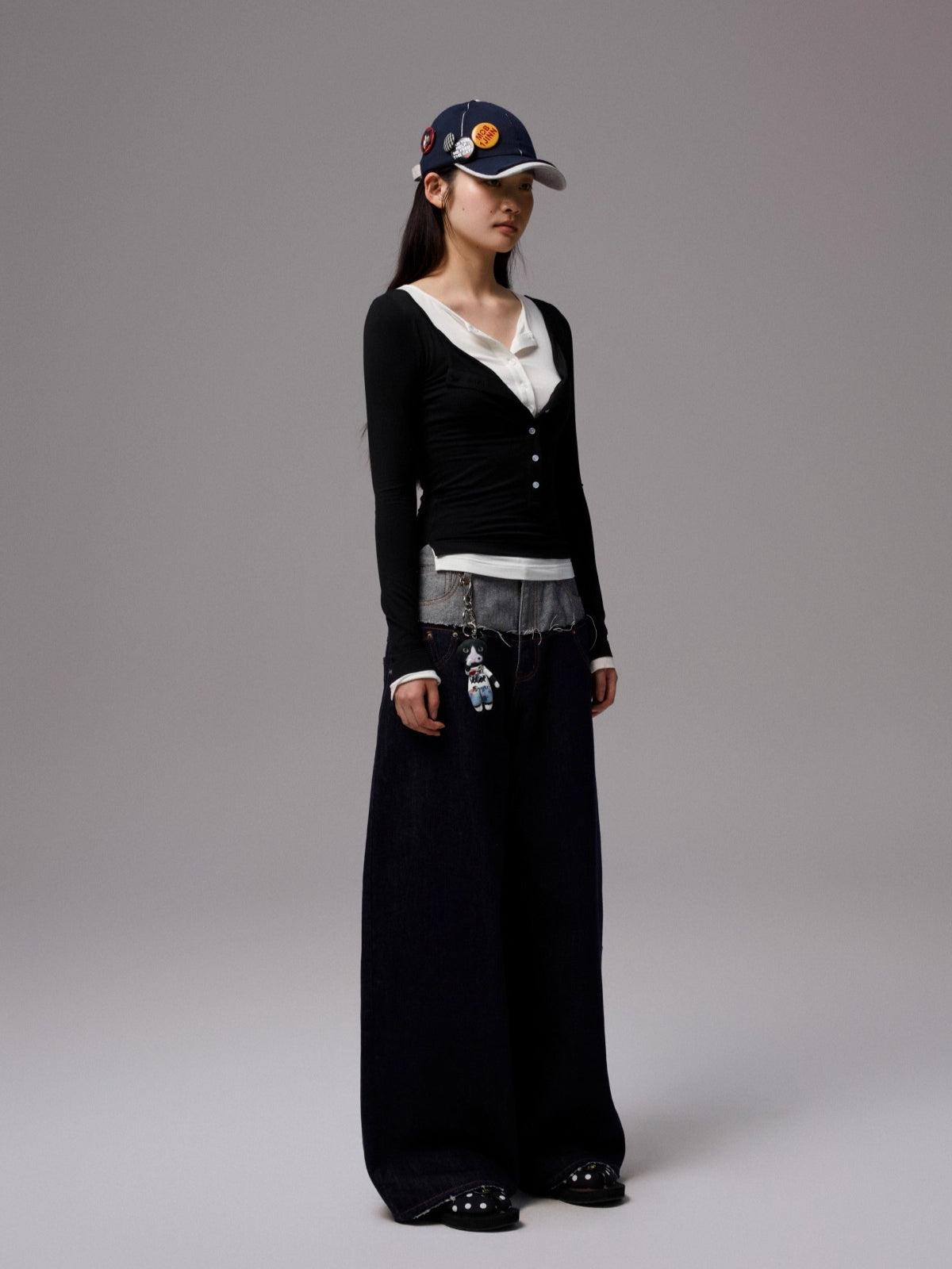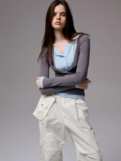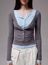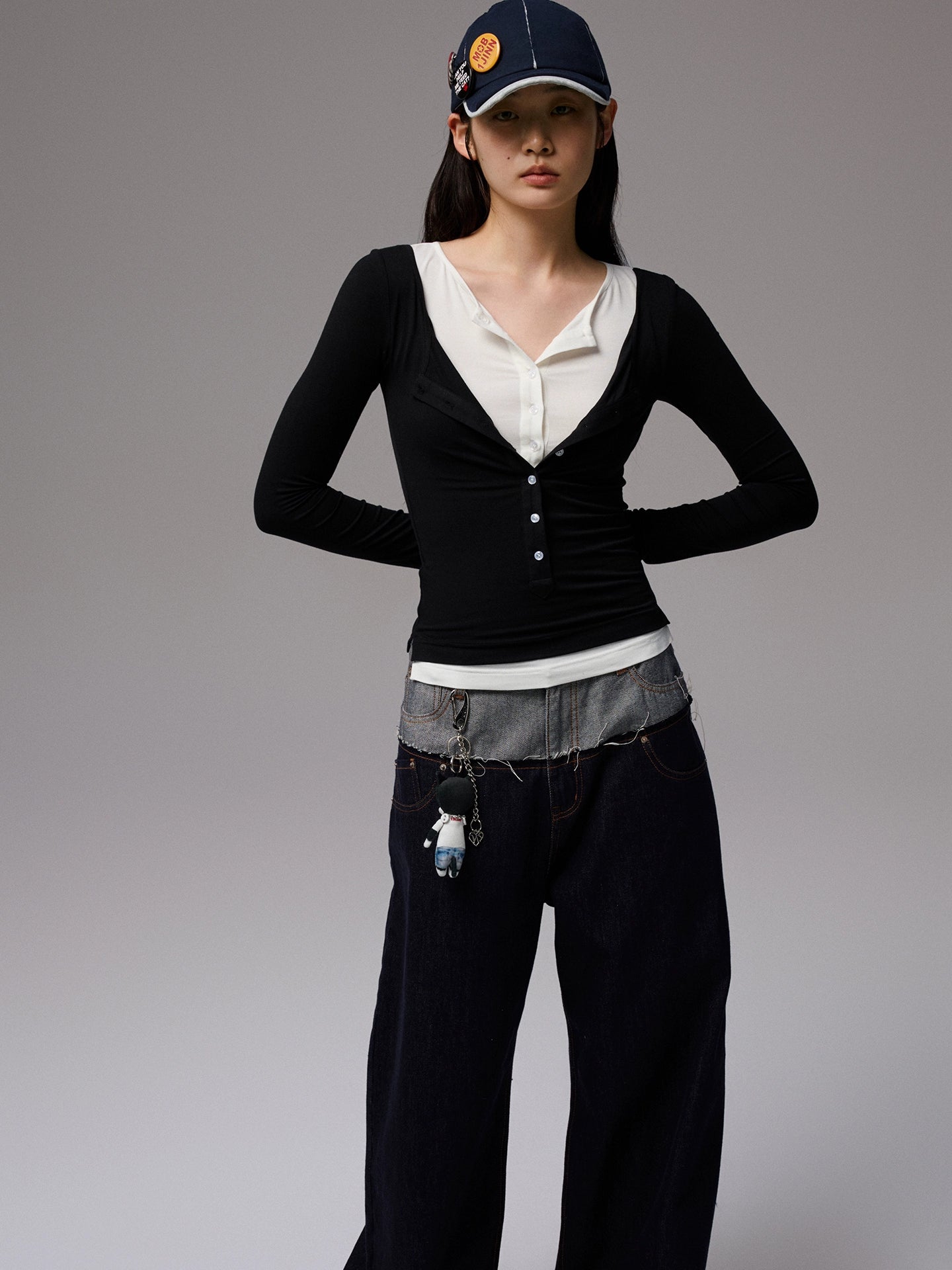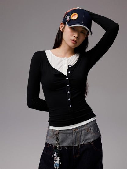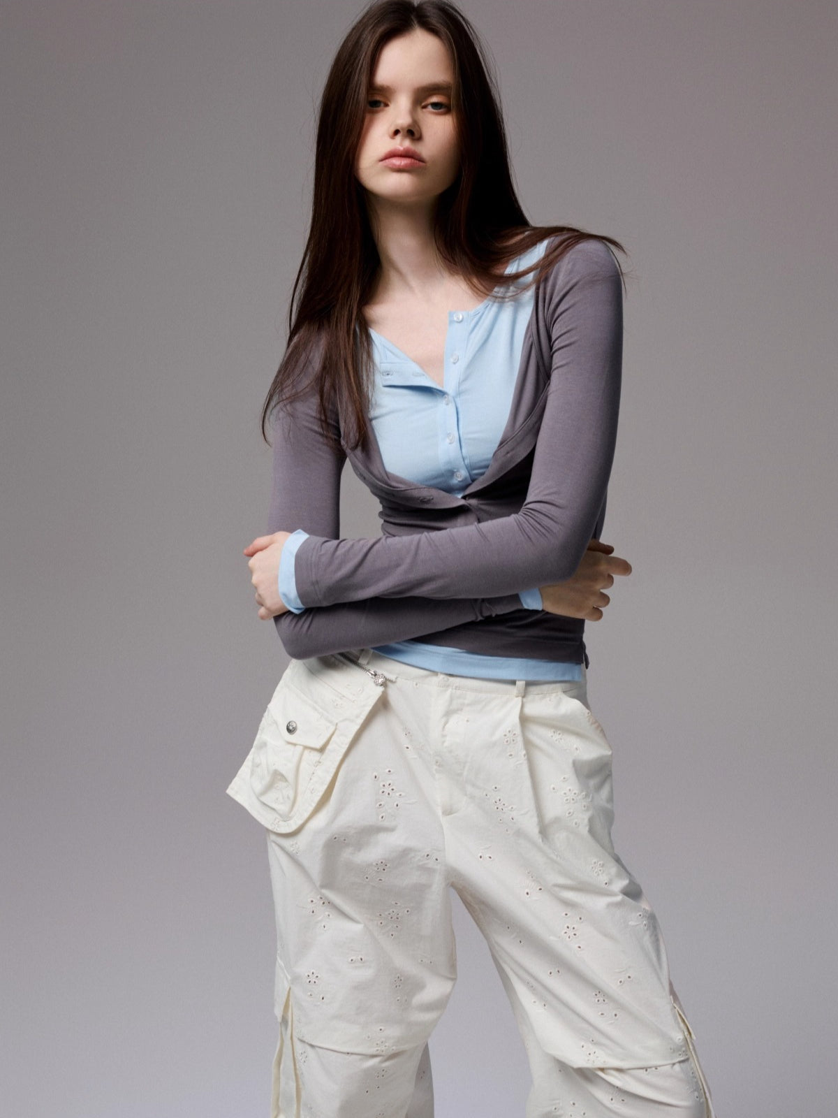 Dual-layer knit Henley collar with an integrated slimming cut and faux two-piece silhouette. The contrast design at the collar, hem, and cuffs creates layered visual effects. Clean but not simple. Made with high-stretch knit for a soft, breathable texture with a skin-friendly, structured finish—balancing ease and style.