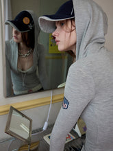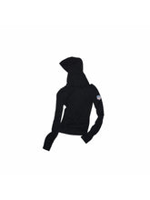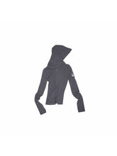Made from breathable modal knit with added stretch, this slim-fit top hugs the body while allowing freedom of movement. Features a hood with hidden front zipper for adjustable styling, a thumbhole cuff design for functionality, and badge patches on the sleeves for detail. The streamlined cut balances sporty energy with urban edge, making it a versatile piece for both layering and solo wear.