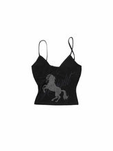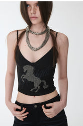 This fitted cable-knit cami top sculpts a sleek silhouette with a sporty yet refined edge. The signature “Knight Horse” rhinestone motif adds metallic brilliance against a textured knit base, highlighting a striking contrast between vintage elegance and modern energy. Crafted from high-elasticity ribbed knit fabric, it offers a structured yet skin-friendly touch. The cropped cut and stable shoulder design make it perfect for layering or standalone wear, delivering both flexibility and visual impact.