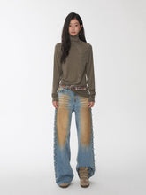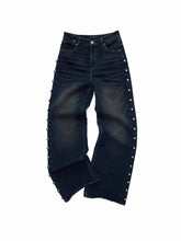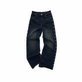 Crafted from premium 100% cotton twill denim, these straight-leg jeans feature a mid-low waist and relaxed silhouette for effortless style and comfort. The side seams are detailed with custom round metal studs for a subtle statement and leg-elongating effect. The mud-dyed wash creates a naturally weathered hue and unique textural depth, reflecting artisanal craftsmanship. The overall washed finish adds a vintage aesthetic while maintaining a structured, flattering fit.