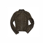 Tailored in a structured, shoulder-balanced silhouette, this short jacket features a sharp stand collar and a classic double-breasted metal button closure inspired by vintage Napoleonic uniforms. The washed high-density cotton canvas delivers a naturally faded texture while maintaining a crisp, sculpted shape. Neutral grey and brown-green tones enhance versatility across multiple styling directions. Designed to frame the waist and define posture, it brings refined strength to everyday looks.