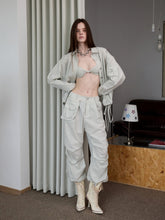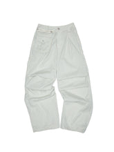 The loose, striped cargo pants include a detachable utility pocket at the waistband and a balloon silhouette with knee pleats for an elevated street‑casual vibe. An adjustable “pig‑nose” button at the hem lets you cinch and style as you please.