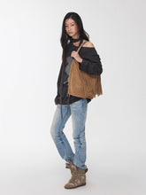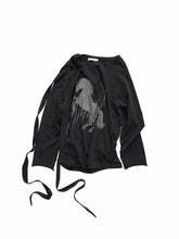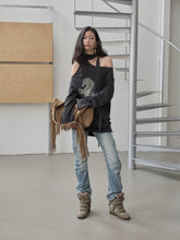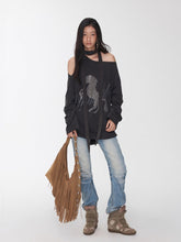 This off-shoulder washed sweatshirt features a loose, relaxed silhouette with asymmetrical shoulder straps for a street-style layering effect. The elongated hanging tie and distressed hem detailing enhance its laid-back yet refined aesthetic. Crafted from 100% cotton with a snowflake-textured double-knit structure, the fabric offers a soft yet structured drape. The brand’s signature equestrian-inspired graphic and rhinestone embellishments add a touch of sparkle and vintage charm.