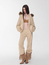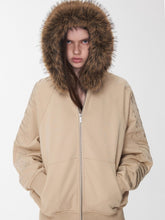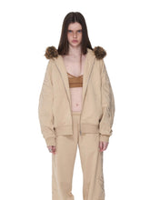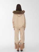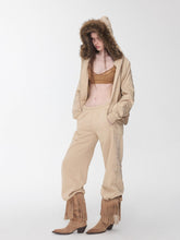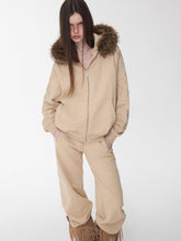 This sweatshirt set features an oversized hooded top and straight-leg sweatpants, cut in a relaxed silhouette that shapes the shoulders while leaving room through the body. The hoodie is decorated with original script embroidery along the side and finished with a detachable faux-fur collar, giving both street and soft-girl styling options. The pants have a loose, straight cut with adjustable drawcords at the waist and leg openings, so you can cinch the shape or wear them relaxed for everyday comfort. Made from dense cotton-blend sweatshirt fabric, the set feels soft against the skin while providing warmth and structure for casual, campus, or travel looks.