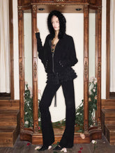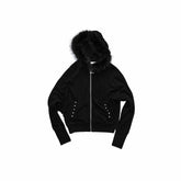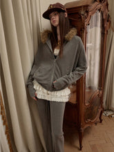 This two-piece set features a batwing-sleeve hoodie with a detachable faux-fur collar, combining relaxed volume with refined stud detailing at the pockets and sleeves for a subtle street edge. The matching micro-flare pants are cut with a softly contoured silhouette, finished with a drawstring waistband and rivet accents to enhance structure and balance. Crafted to feel effortless yet styled, the set moves easily between casual layering and statement off-duty looks. The plush brushed fabric offers a soft hand feel with natural drape and warmth, making it suitable for transitional seasons.