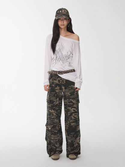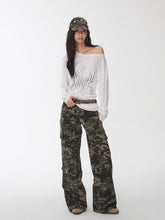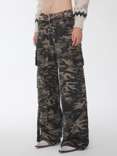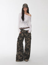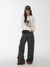 Washed Camo Multi-Pocket Cargo Wide-Leg Pants