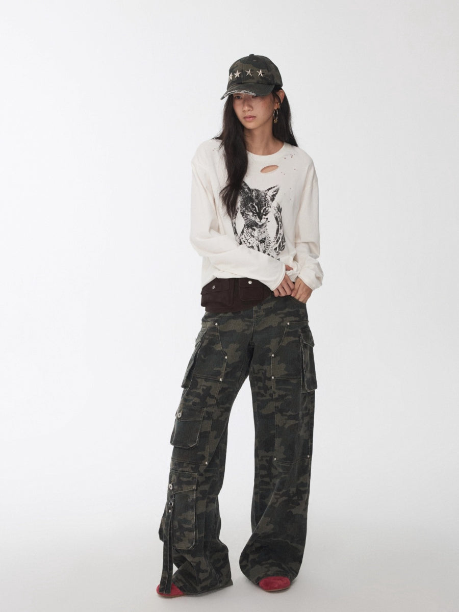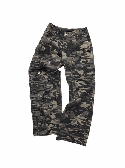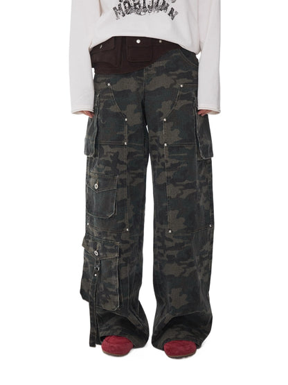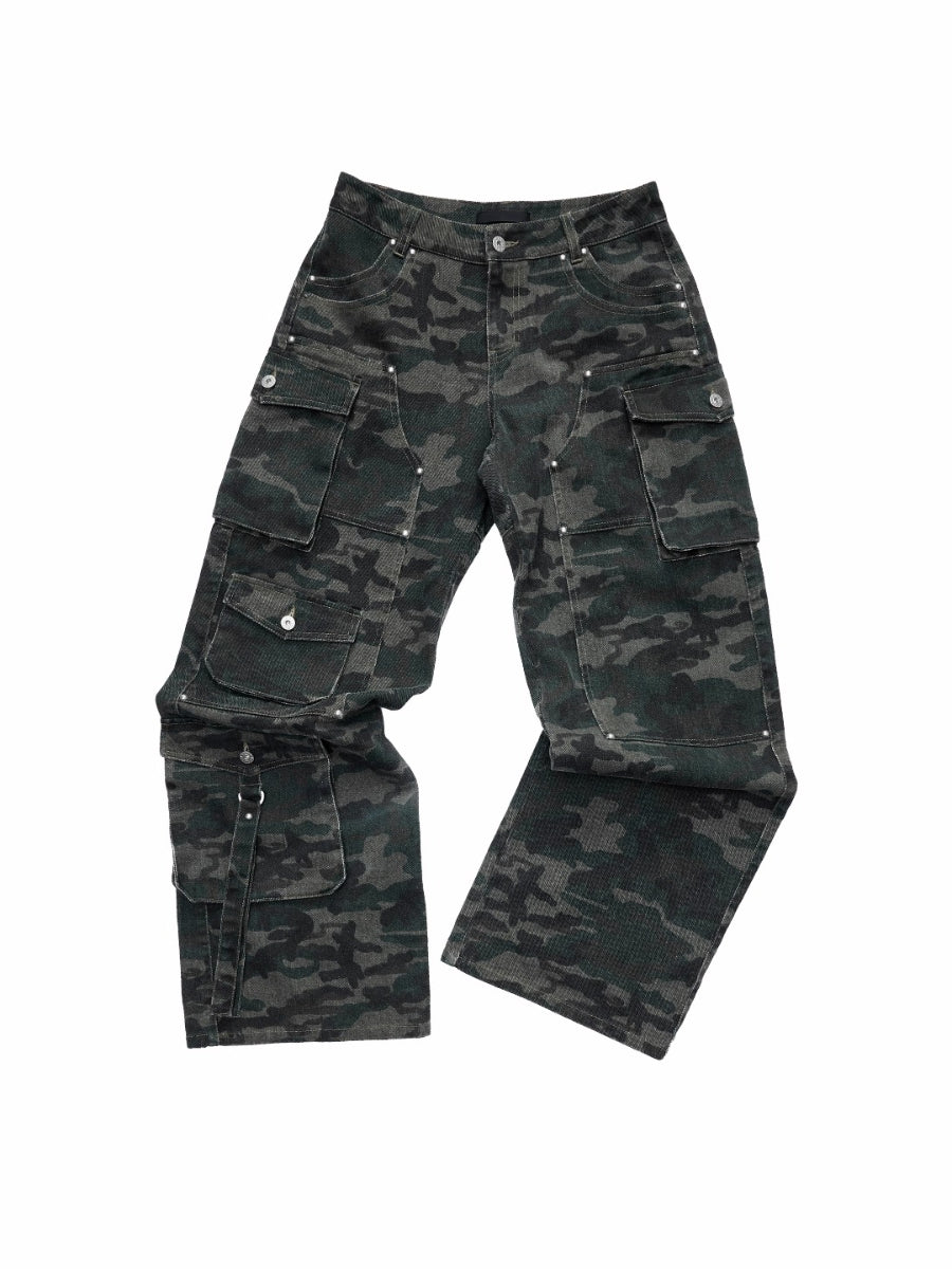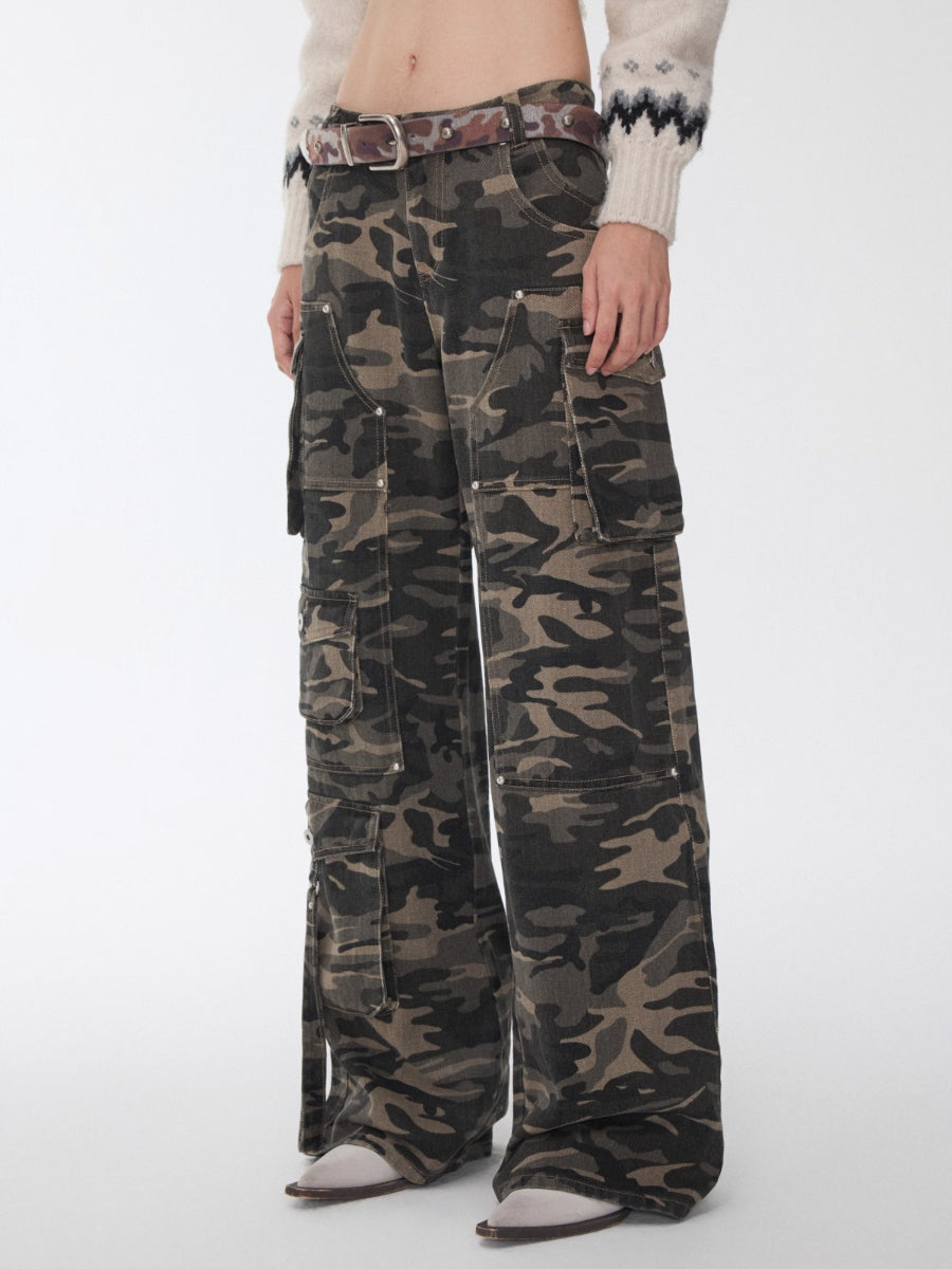 These washed camouflage cargo pants feature a relaxed mid-rise silhouette with irregular seam detailing and matte silver rivet accents for a structured, street-inspired edge. Designed with multiple functional 3D utility pockets and side D-ring straps, they add both layering depth and urban mobility. Crafted from durable washed camo denim, the fabric offers a rich texture and worn-in look through heavy washing and fading treatments. The loose wide-leg fit delivers effortless comfort and adaptability, perfectly balancing utility and street style for daily wear.