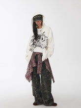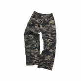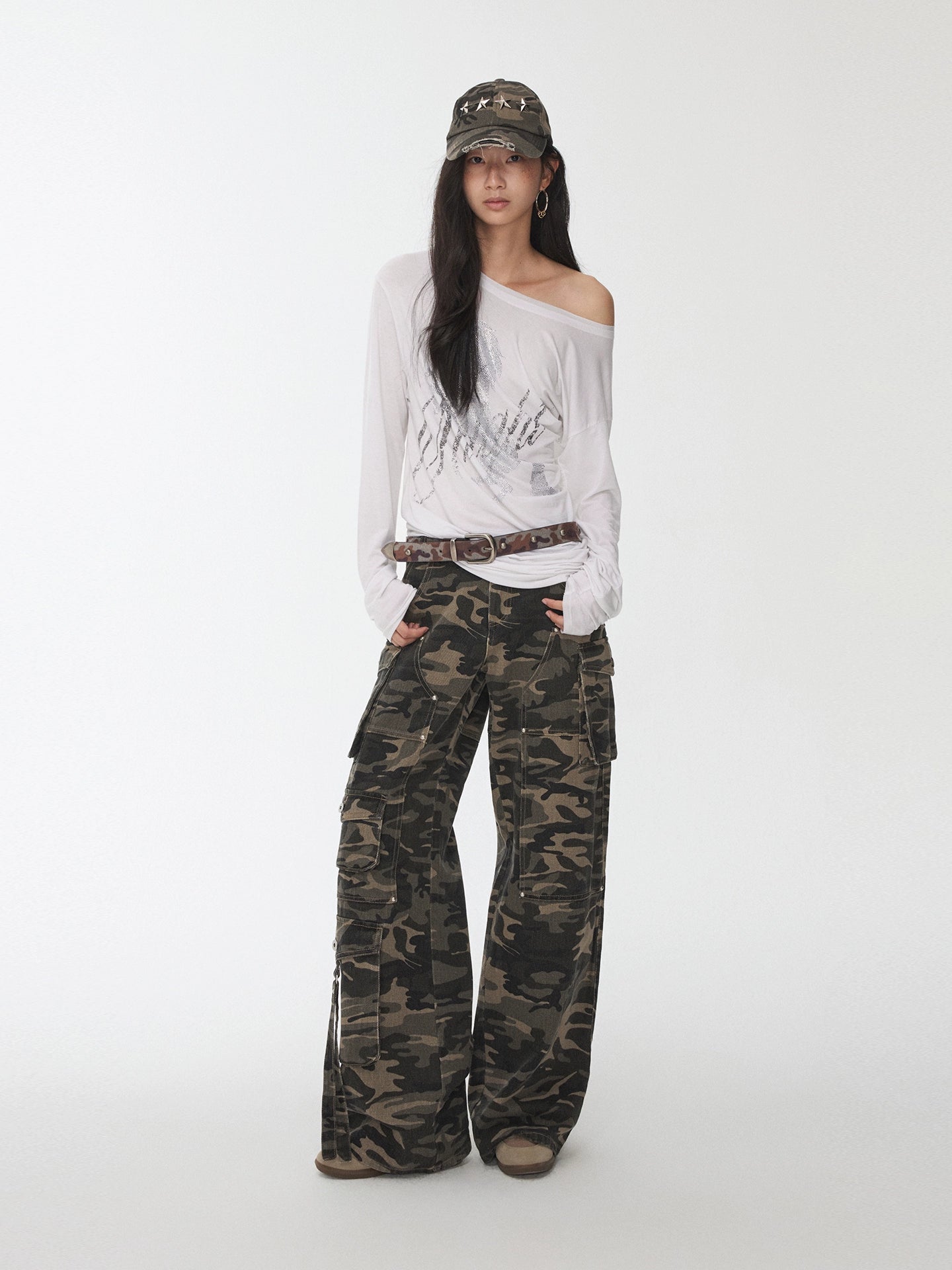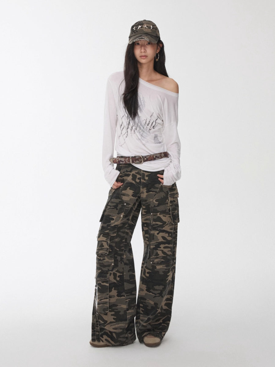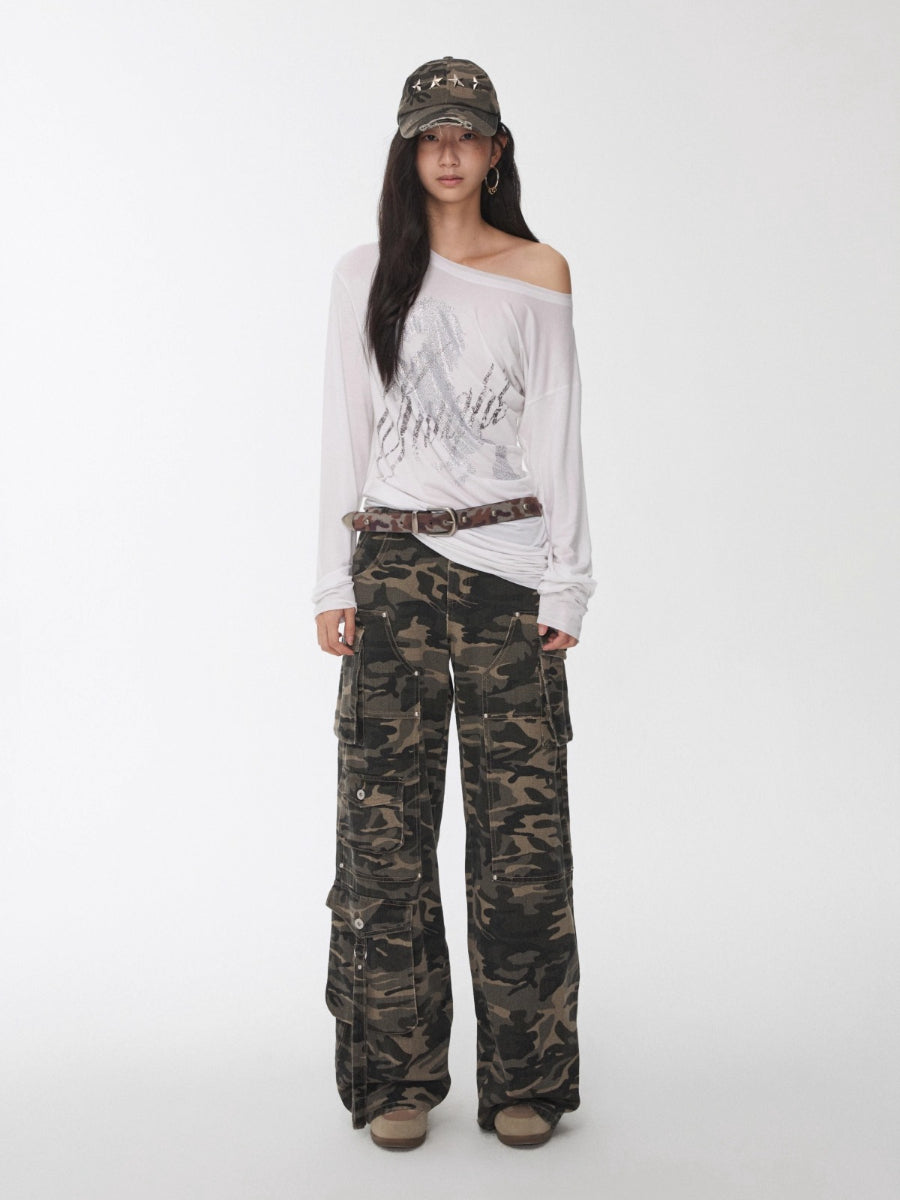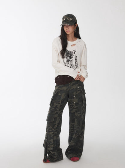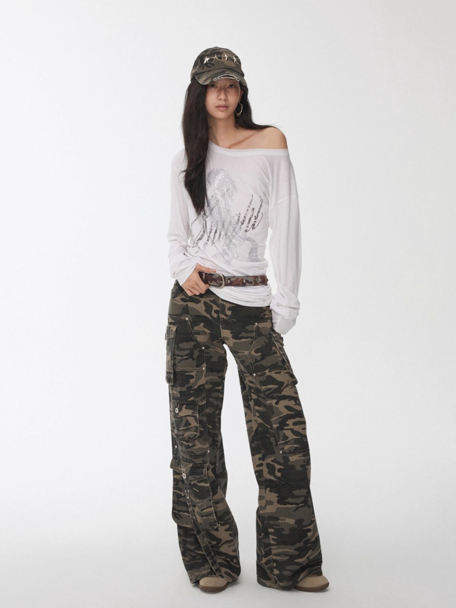 These washed camouflage cargo pants feature a relaxed mid-rise silhouette with irregular seam detailing and matte silver rivet accents for a structured, street-inspired edge. Designed with multiple functional 3D utility pockets and side D-ring straps, they add both layering depth and urban mobility. Crafted from durable washed camo denim, the fabric offers a rich texture and worn-in look through heavy washing and fading treatments. The loose wide-leg fit delivers effortless comfort and adaptability, perfectly balancing utility and street style for daily wear.