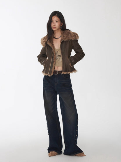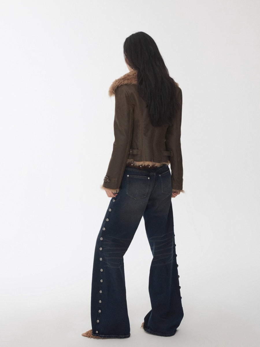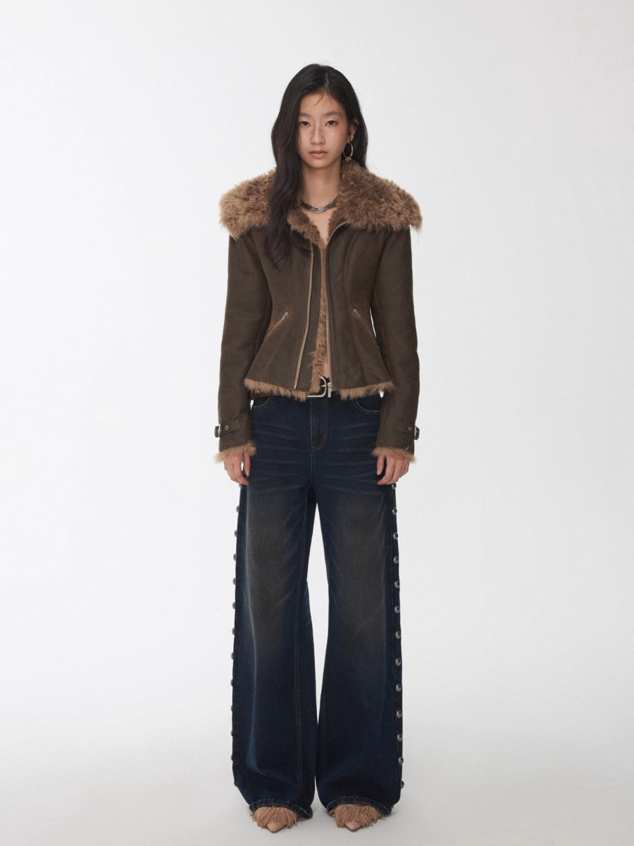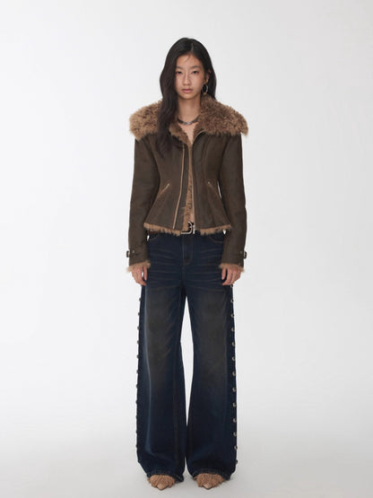 This faux-shearling jacket features a tailored slim-fit silhouette that highlights the waist while maintaining a structured yet casual appeal. The oversized lapel collar enhances proportion balance, while multi-panel construction and metal zip pockets add depth and versatility. Adjustable buckle tabs at the hem allow a customized fit, infusing the piece with a modern moto edge. Crafted from high-quality washed crack-textured eco-leather fused with plush faux shearling lining, it combines softness, warmth, and a refined vintage finish that’s perfect for winter layering.