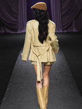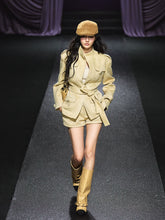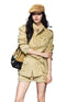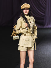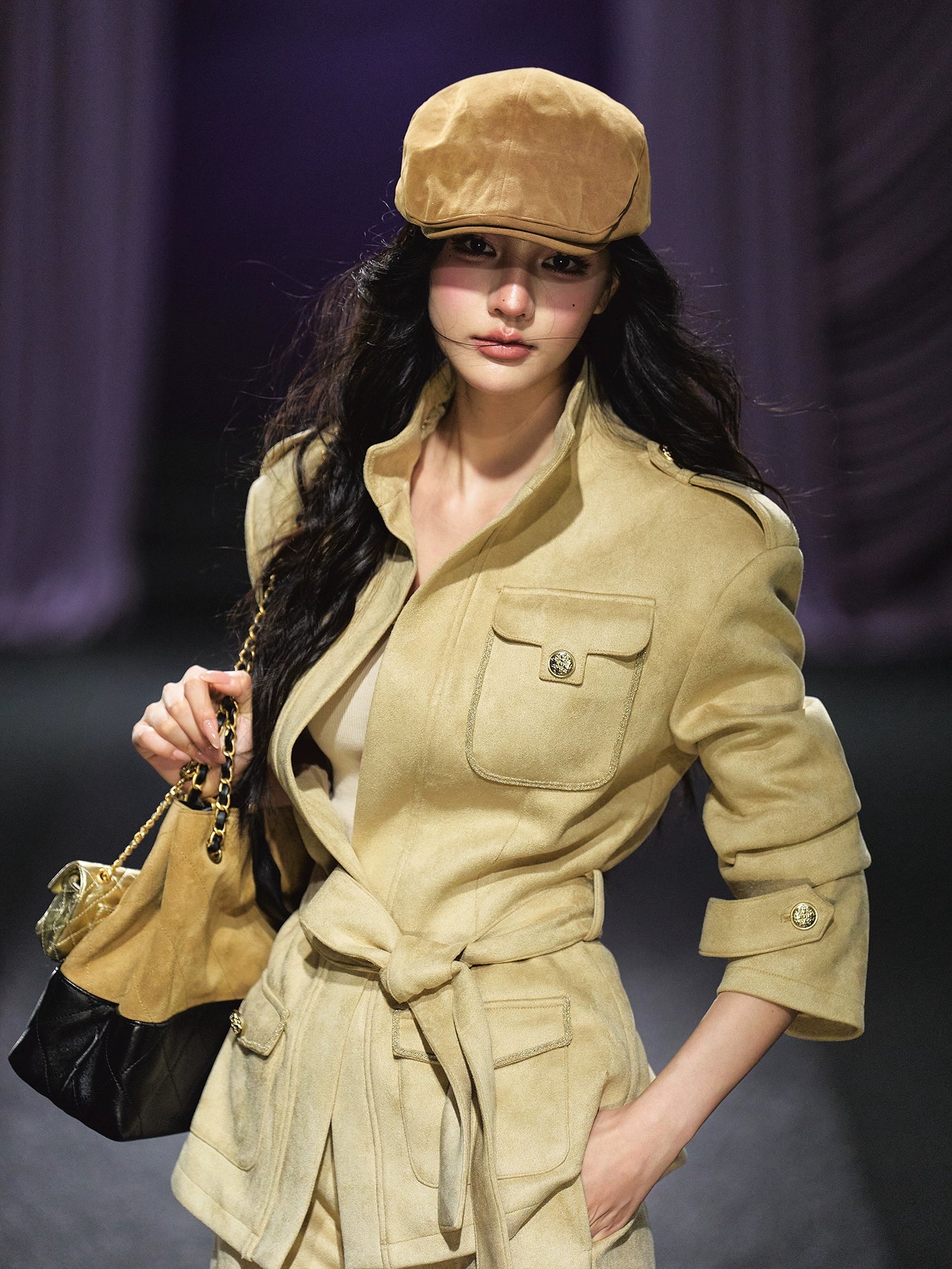 This elegant two-piece set features a sand-pink faux-suede jacket with a structured stand collar and a waist-cinching silhouette, paired with matching tweed-inspired shorts. The fabric blends nylon and viscose for a smooth, velvety hand feel that maintains shape and comfort. Perfect for transitioning between seasons, the set delivers understated luxury with a touch of vintage polish — ideal for both casual chic and refined daywear looks.