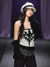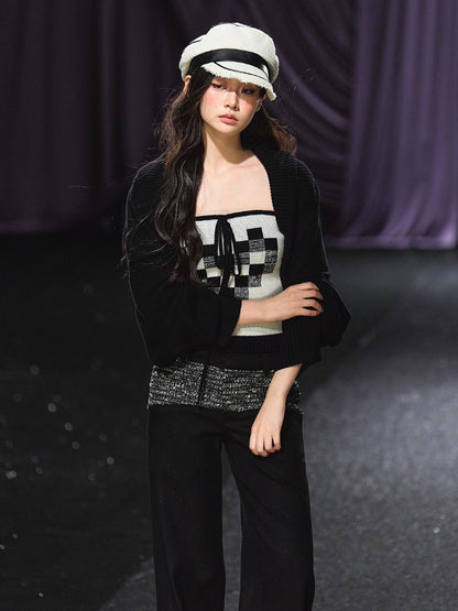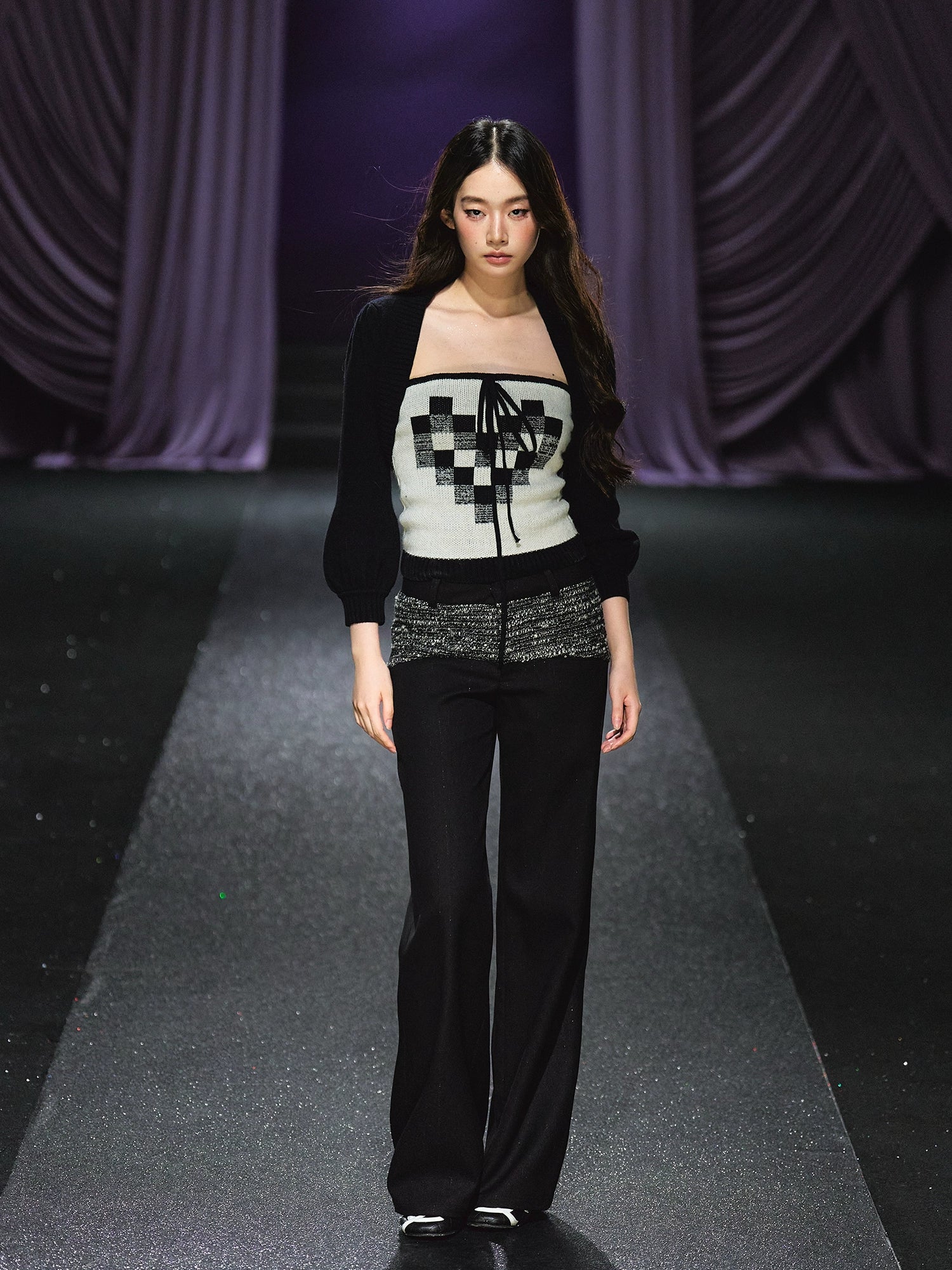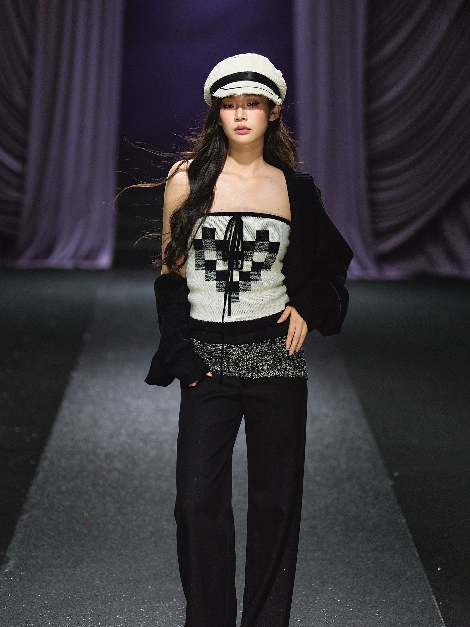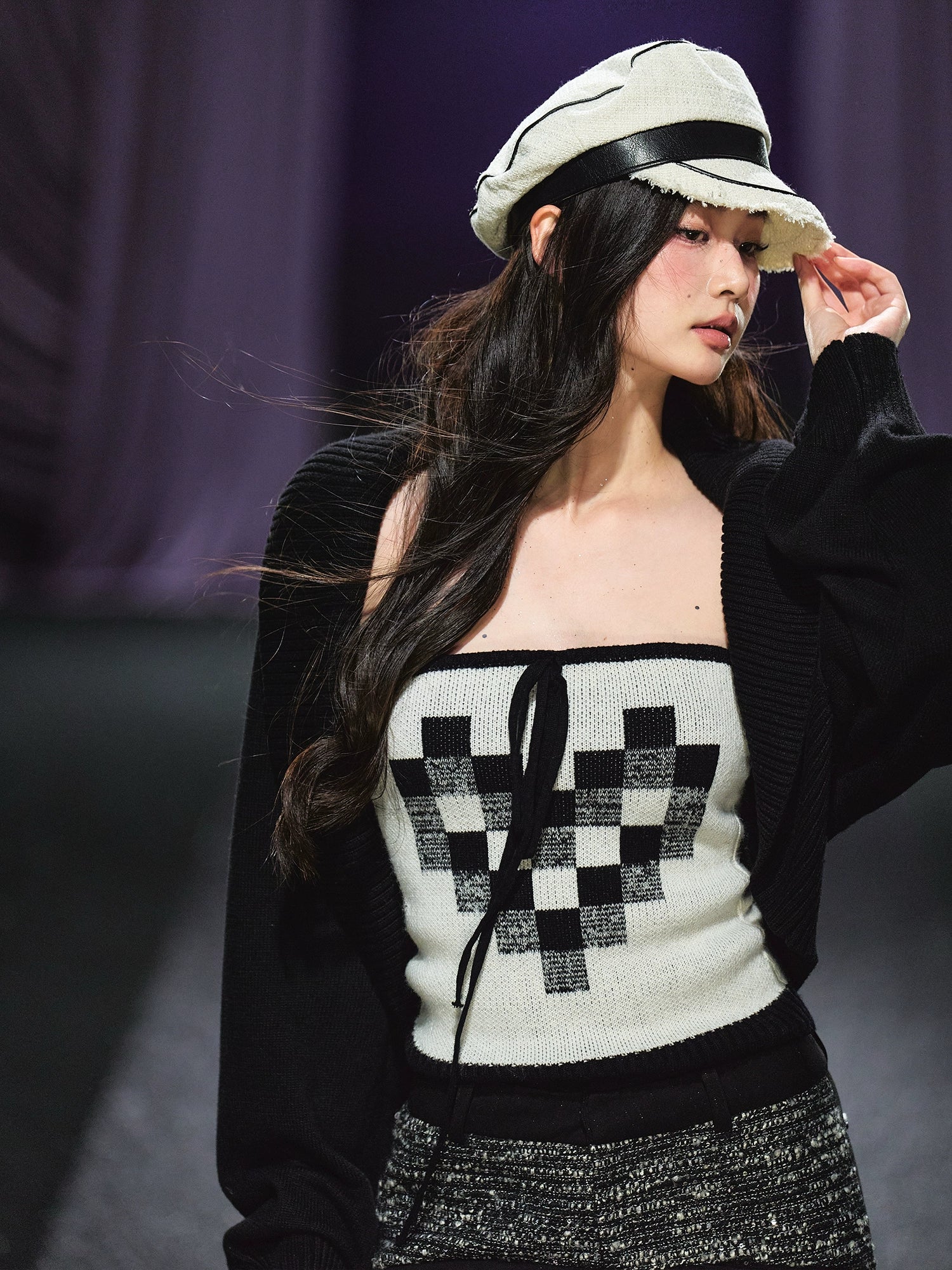 A chic two-piece knit set combining a mosaic-patterned heart tube top with a relaxed-fit wool-blend cardigan. The strapless top sculpts the figure, while the soft-touch cardigan adds dimension and warmth with a subtly slouchy silhouette. Both pieces are crafted from fine blended yarns for a textured yet comfortable feel — perfect for layering through transitional seasons or pairing separately for versatile styling.