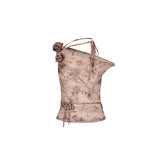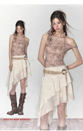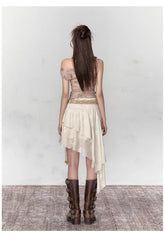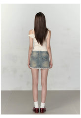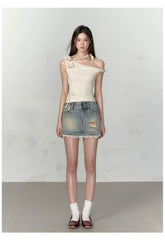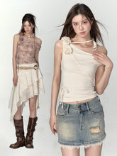 The off-shoulder drape highlights the neckline’s elegant lines, and pairing with a denim mini-skirt conveys a steady, fashion-forward aura. A sleek camisole integrates rose ribbon straps at the halter and a tie-waist accent, adding playful detailing to break up the monotony.