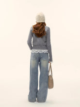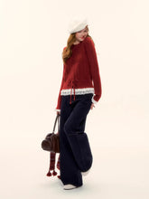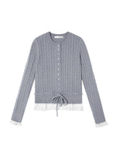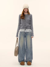 This knitted sweater features a classic cable-knit texture with delicate lace trim at the hem, adding a soft vintage touch to the overall silhouette. Designed with an adjustable drawstring waist, it subtly defines the waistline while maintaining comfort and flexibility for everyday wear. The balanced thickness and regular fit make it suitable for seasonal layering, whether styled alone or paired with outerwear for a refined casual look.