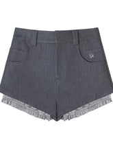 Tailored shorts with a sophisticated two-piece illusion design crafted from smooth, structured suiting fabric that resists wrinkles and maintains shape. The high-waist A-line silhouette visually lengthens the legs, while the faux layered hem adds depth and dimension. Finished with contrast detailing for a modern, chic look suitable for both casual and dressy outfits.