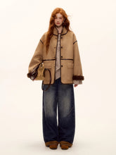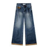 These jeans combine classic denim with suede patchwork for a unique textured finish and soft touch. The high-waisted, straight-cut silhouette elongates the legs and flatters the waistline, creating an effortlessly slimming effect. Featuring subtle “cat-whisker” fading and cuffed hems, they add a vintage touch while maintaining modern streetwear appeal. The perfect blend of structure and drape makes them ideal for pairing with both fitted tops and oversized jackets.