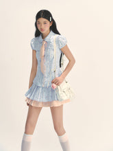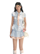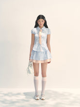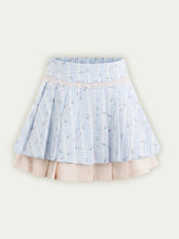 This fresh light blue set features playful prints over checkered base patterns for a lively, fun aesthetic. The shirt + mini skirt combination enhances body proportions for a complete, stylish look. The peter pan collar is full and smooth with playful charm. The slightly fitted shirt flatters the figure while ensuring comfort. Curved hem adds softness to the design. Elastic puff sleeves create a cute, full bud-like shape. The pink diagonal tie can be styled as either a bow or necktie for added girlish charm. The high-waisted pleated skirt combines pink and blue pleats, with color contrast creating vibrant youthful energy. The cropped design elongates legs and perfects proportions. Custom-dyed pink lace trims adorn both top and skirt for refined detailing. The A-line skirt with neat, straight pleats adds lively playfulness. Built-in matching shorts ensure safety and aesthetic appeal when worn.