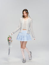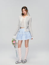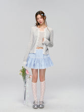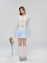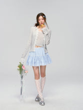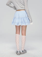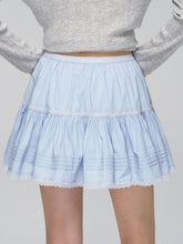 This sweet and flowy skirt features a layered ruffled silhouette in a soft pastel blue hue. Designed with an elastic waist for comfort and decorated with lace trim and pintuck detailing, it offers a flattering and breathable fit perfect for spring. A subtle flared shape adds playful femininity.