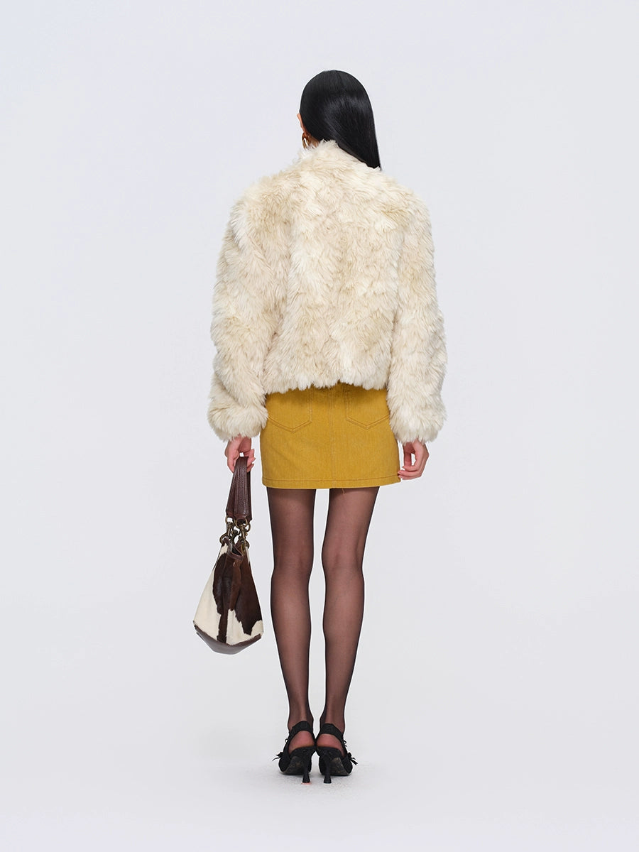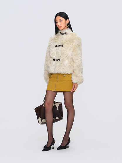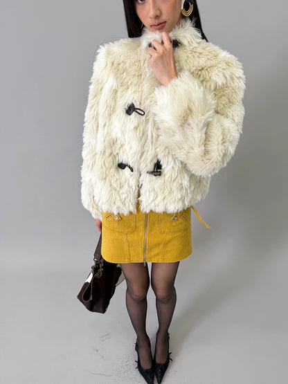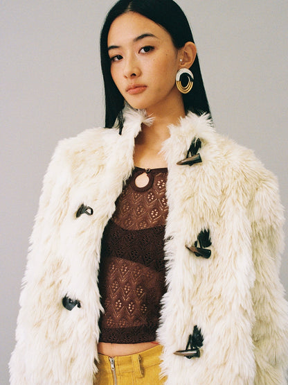 Plush faux-fur fabric in a non-stretch blend delivers a soft hand and cozy warmth. A clean stand collar and classic toggle closures shape a relaxed, cropped silhouette with vintage character. Easy to style with denim, skirts, or tailored pants for commute and weekend looks. Fully finished lining and neat seams keep it comfortable and polished.