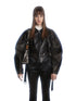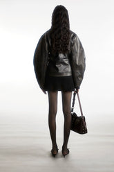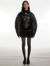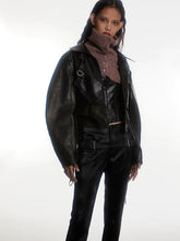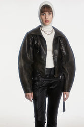This oversized leather jacket is made from recycled leather, with spray-painted effects for a unique, distressed finish. The jacket combines both modern and vintage elements with a hard texture that feels like worn leather. The stylish, asymmetrical design of the jacket offers versatility, perfect for creating a variety of outfits. With its comfortable fit and thick construction, this jacket is perfect for colder seasons and adds a bold statement to your wardrobe.