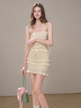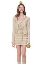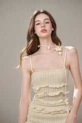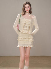 A romantic three-piece knit set featuring a cropped cardigan, a scalloped-edge camisole, and a ruffled mini skirt. Crafted from a soft, breathable blend of acrylic, polyester, modal, and nylon, it feels like a gentle embrace on the skin. The creamy hue and intricate openwork detailing create a sweet yet sophisticated look, perfect for cozy autumn days or relaxed weekend moments.