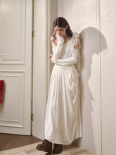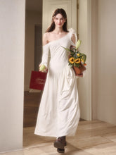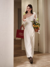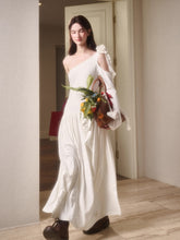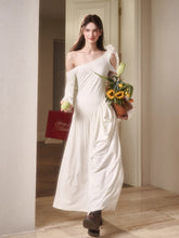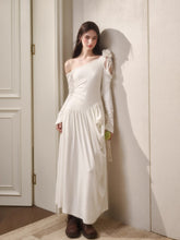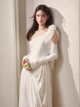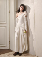 A minimalist yet elegant white knit dress that captures the purity and warmth of winter light. Made from soft rayon-blend fabric with a subtle sheen, it flows gracefully while maintaining a structured drape. The asymmetrical off-shoulder silhouette is adorned with delicate lace and a handcrafted rose accent, blending softness and strength in one refined form. Its flattering cut gently contours the body, making it perfect for winter gatherings or serene everyday moments.