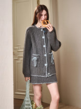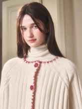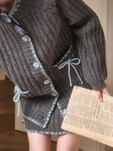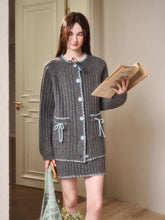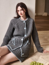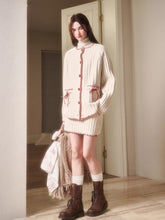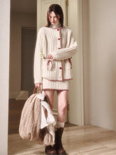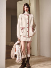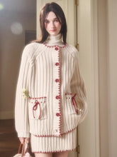 This sophisticated knit set blends comfort and charm with a hint of playful contrast. Crafted from a soft wool blend, the design features hand-sewn red contrast edges, intricate rib knitting, and delicate bow embellishments. The long top drapes elegantly, paired with a fitted high-waist skirt that flatters the figure while maintaining a relaxed silhouette. Perfect for cozy gatherings or stylish daily wear, this cream-toned set delivers warmth and texture with refined detailing.