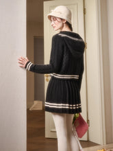 This preppy two-piece set combines warmth and sophistication with a youthful collegiate edge. Made from a soft wool-blend knit, it features a cropped cardigan and a pleated mini skirt designed for structure and movement. The delicate contrast stripes, ribbed edges, and hand-knitted bow details highlight the brand’s refined craftsmanship. With a fitted waist and relaxed silhouette, this set effortlessly balances elegance and playfulness—perfect for both campus days and casual outings.