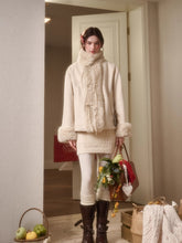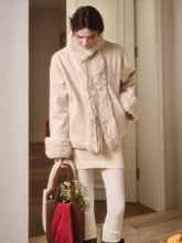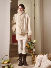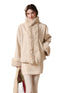 This jacket combines classic tailoring with modern coziness, featuring a faux shearling lining for exceptional warmth and softness. The structured stand collar and tie belt highlight the waist, while the subtle suede texture adds a refined vintage charm. Its soft ivory tone and plush interior make it the perfect companion for winter travels, keeping you comfortably chic from city walks to snowy escapes.