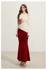 This two-piece set combines an asymmetrical one-shoulder sweater with a low-waist mermaid skirt, blending avant-garde style with versatility. The knit top features an irregular diagonal neckline for a modern edge, while the skirt highlights a fishtail silhouette that flatters curves and offers mix-and-match styling options. Playful details, such as detachable hem panels and a dual-wear design, make it suitable for both casual and statement looks.