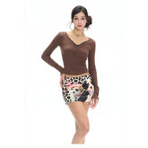 A trendy low-rise mini skirt in a bold leopard print. Features a figure-hugging silhouette with flattering fit around the hips. Perfect for adding edge to your look, whether styled with basics or layered for a statement outfit.