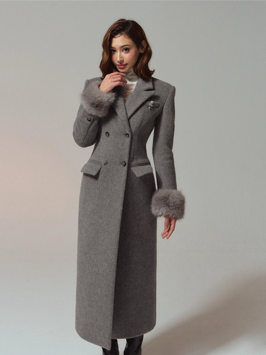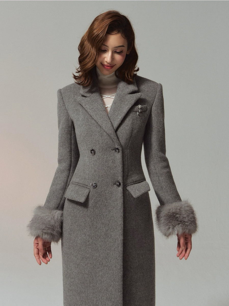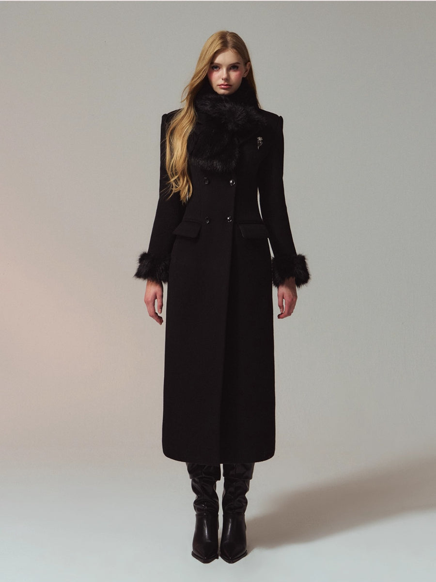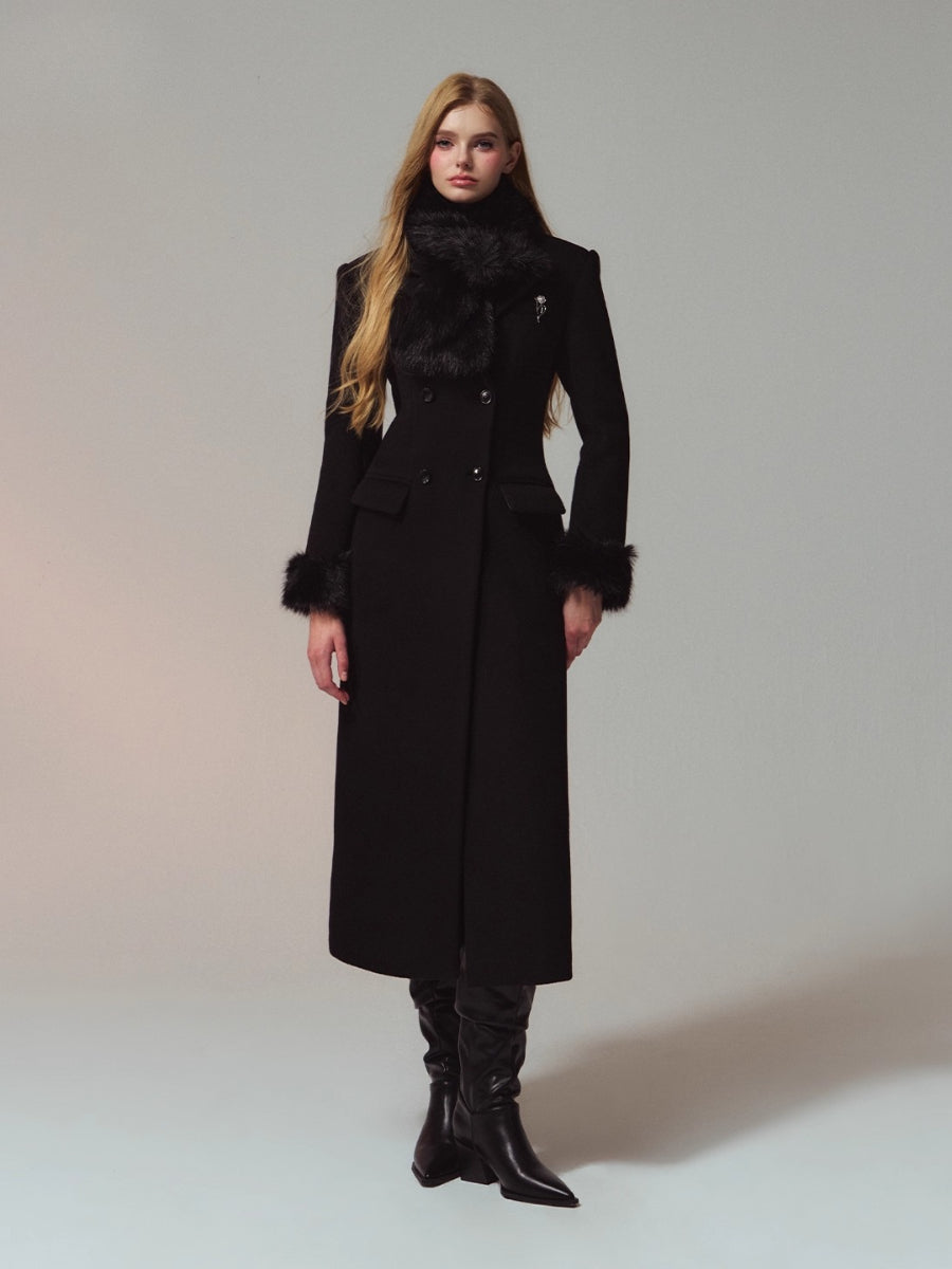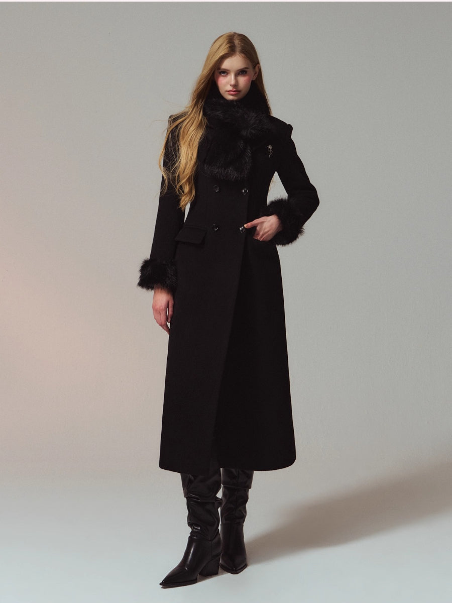 A premium long coat cut from double-faced merino wool for a warm, smooth hand and structured drape. Hourglass waist shaping builds an elegant proportion, while the clean shoulders and double-breasted front project quiet presence. Plush faux-fur collar and cuffs add soft volume and winter polish without bulk. Wear from commute to dinner over knits or dresses with an elongated, refined silhouette.