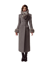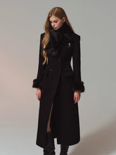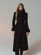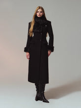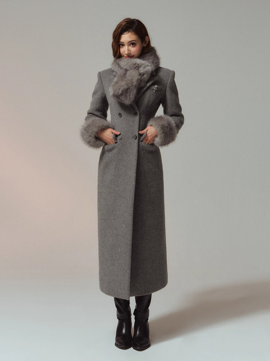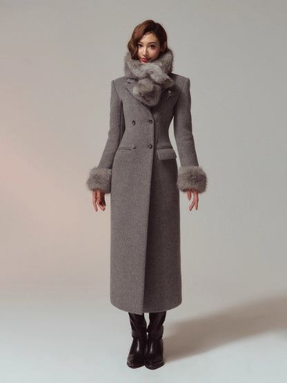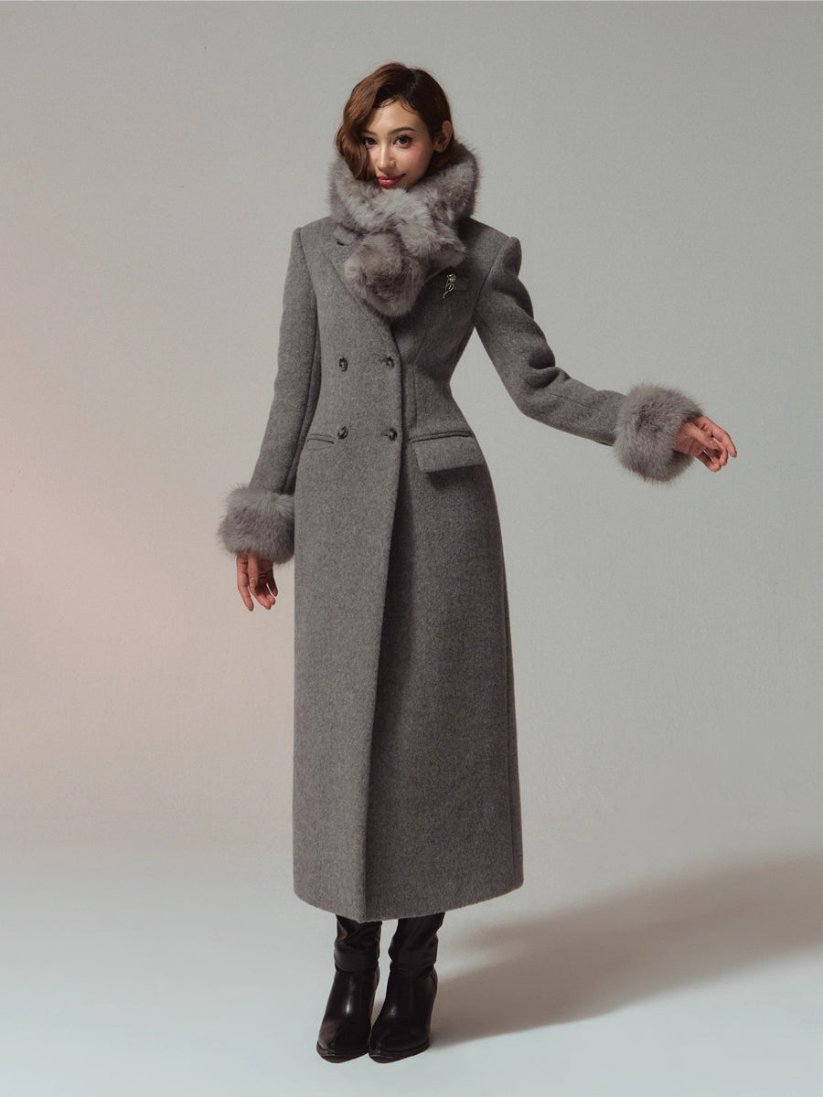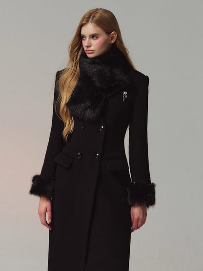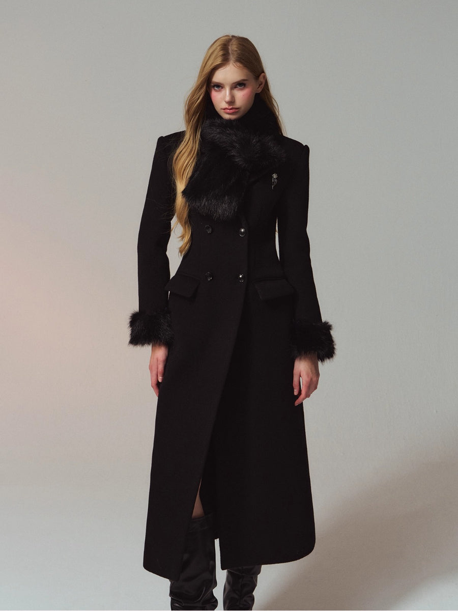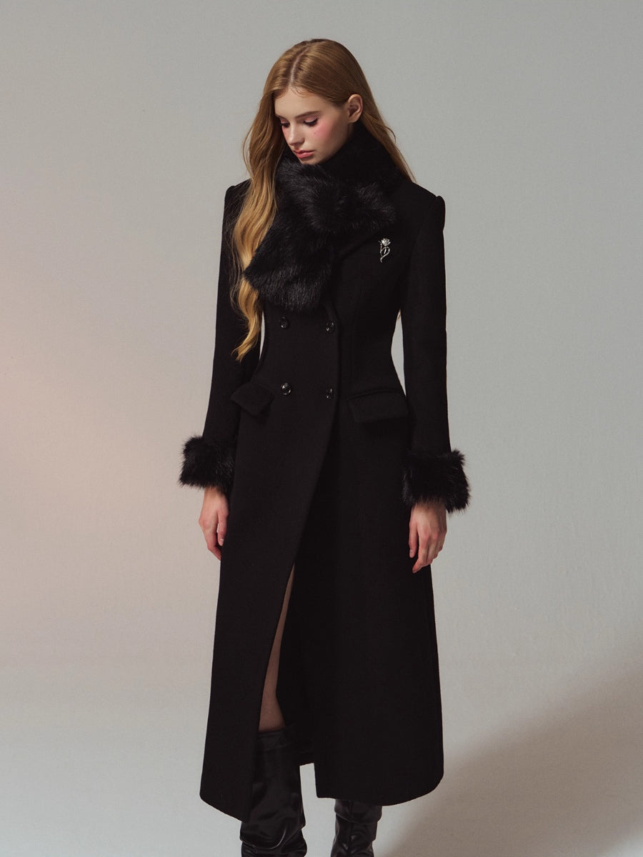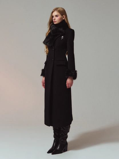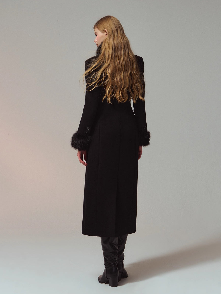 A premium long coat cut from double-faced merino wool for a warm, smooth hand and structured drape. Hourglass waist shaping builds an elegant proportion, while the clean shoulders and double-breasted front project quiet presence. Plush faux-fur collar and cuffs add soft volume and winter polish without bulk. Wear from commute to dinner over knits or dresses with an elongated, refined silhouette.