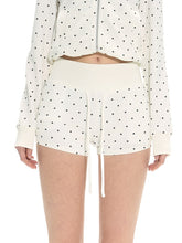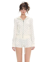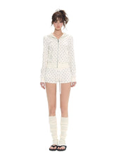 This white set features a slim-fit hoodie in playful polka-dot splice panels and matching high-waist shorts, perfect for a cozy, casual look.