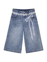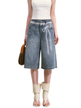 These pants feature an imitation - lace print and a high - waist design. They are mid - length denim pants.